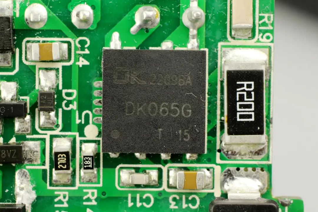 充電器初級主控芯片采用了一顆來自東科的合封氮化鎵芯片DK065G,是一顆內(nèi)部集成了650V氮化鎵開關(guān)管的準諧振反激開關(guān)電源功率芯片。DK065G采用谷底開通以降低開關(guān)損耗,最高支持250kHz開關(guān)頻率,待機功耗低于50mW,采用DFN8*8封裝,適用于PD快充,電源適配器等應用。