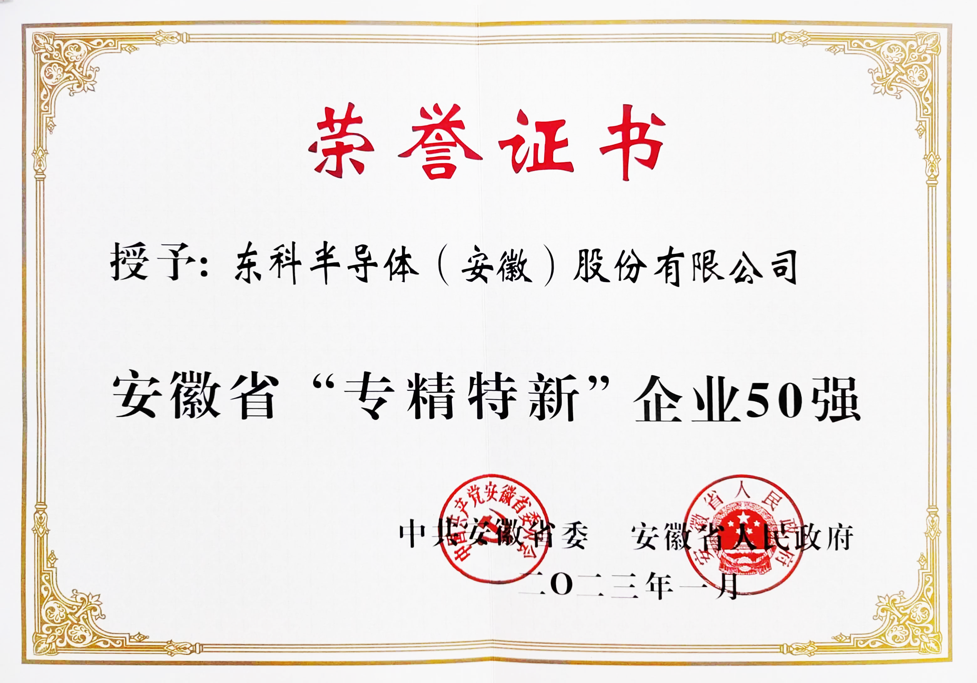 東科半導體榮獲:安徽省“專精特新”企業(yè)50強