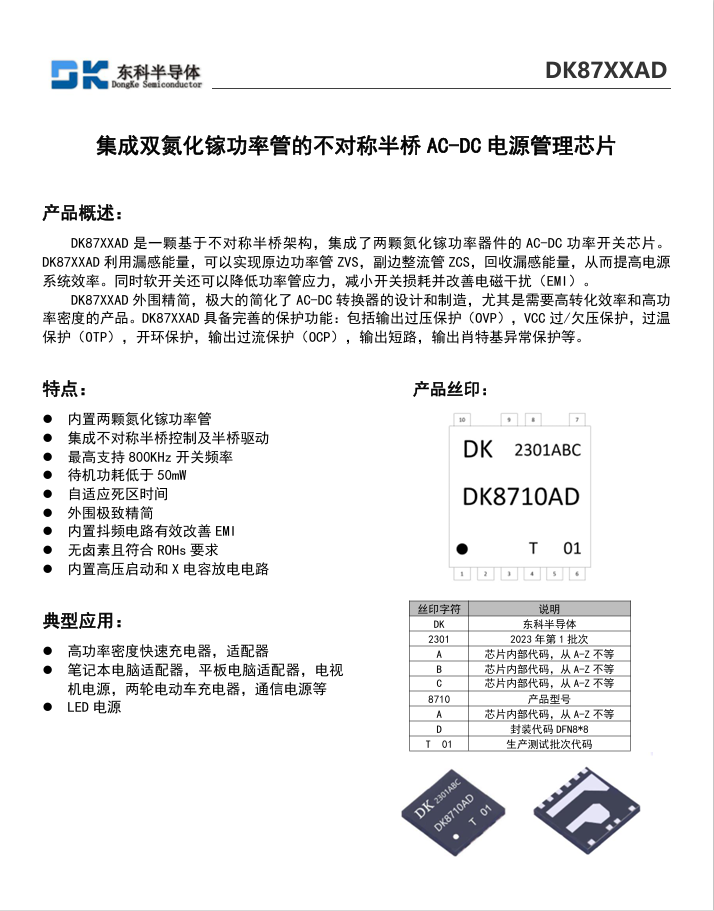 東科半導體推出基于不對稱半橋架構(gòu)的全合封氮化鎵AC-DC電源管理芯片DK8715AD系列