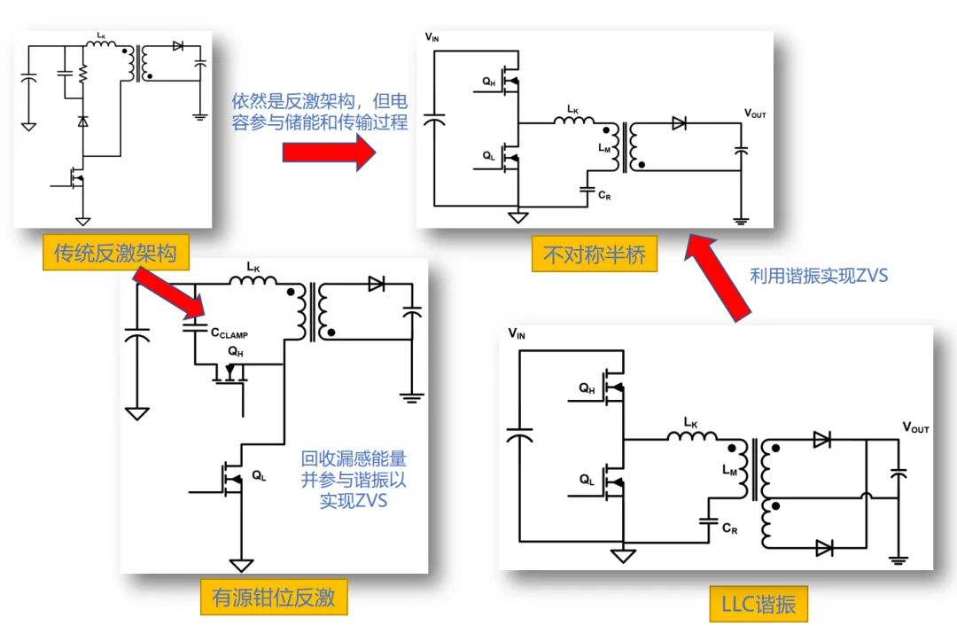 不對稱半橋AHB拓撲技術(shù)集成了LLC和反激的優(yōu)點,實現(xiàn)了初級側(cè)零電壓開關(guān)(ZVS)和次級側(cè)零電流開關(guān)(ZCS),提高了系統(tǒng)的效率。通過采用電感與電容雙儲能元件,可以有效減小變壓器體積,從而提高系統(tǒng)的整體緊湊性。
